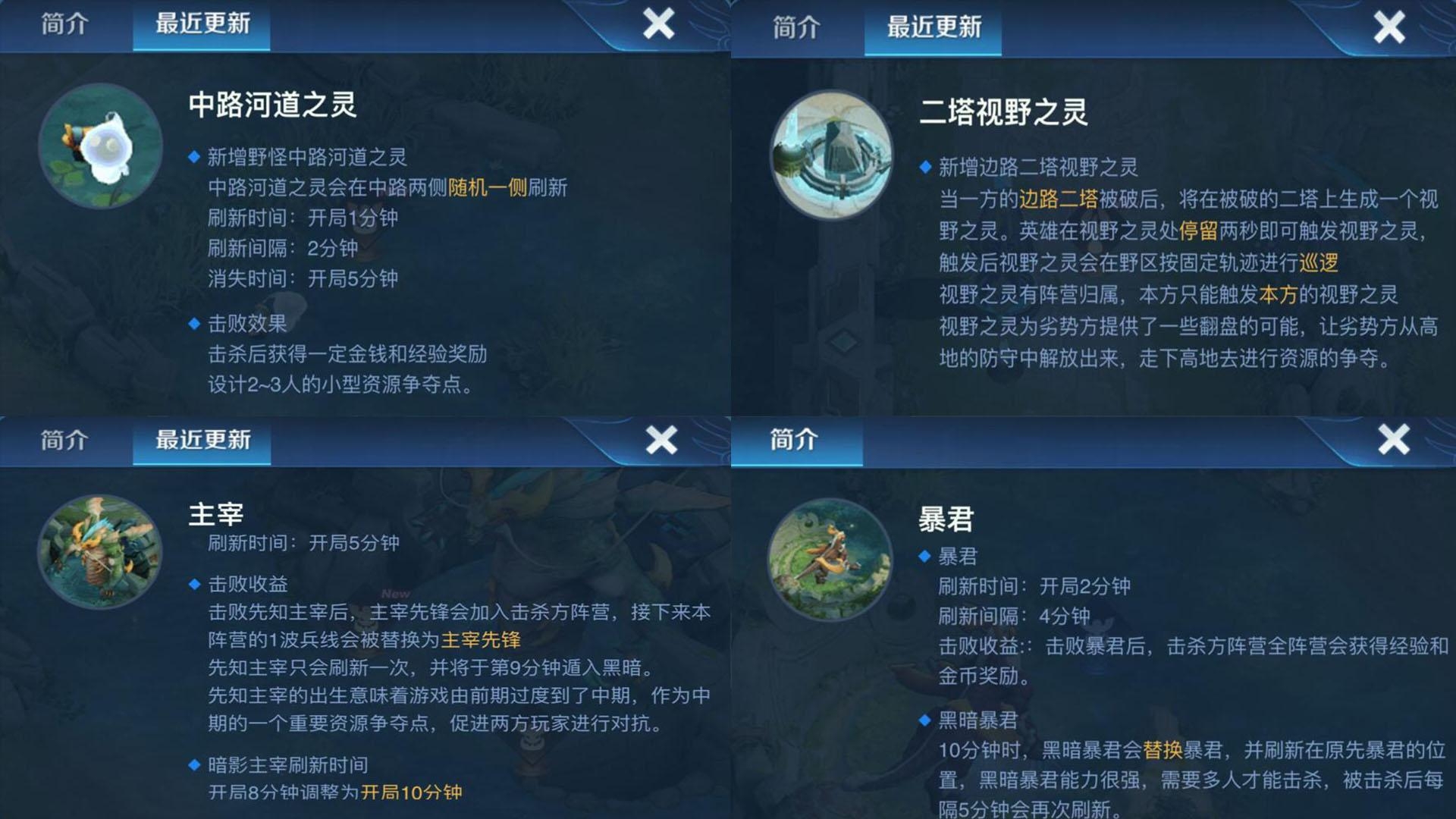 野怪方面中路河道前五分钟会增加河道之灵,边路河道之灵击杀后平分经济;二塔击破后可以召唤一个视野之灵侦查附近野区;主宰刷新时间推迟至十分钟,五分钟至九分钟期间可以击杀一次先锋主宰,二十分钟后主宰变为风暴暴君。
