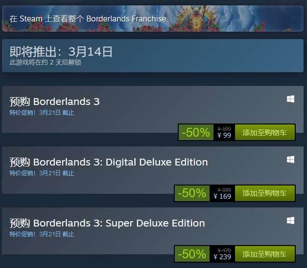 从此次公开的优惠预购细节来看,Steam《无主之地3》标准版售价99元,数字豪华版169元,超级豪华版239元,以上版本均为半价预购特惠,其中的标准版更是给出了低于100元的价格。