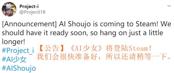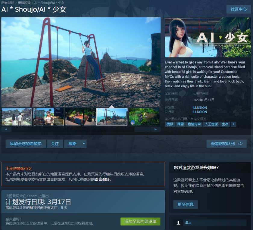 目前《AI少女》也已经在Steam商城正式上线,商店页面显示计划发行时间为3月17日,不支持简体中文(Steam商城链接)。