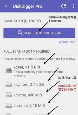 1、打开手机上的diskdigger工具,打开之后点击软件界面上的扫描功能选项,当然root后恢复的文件更多;