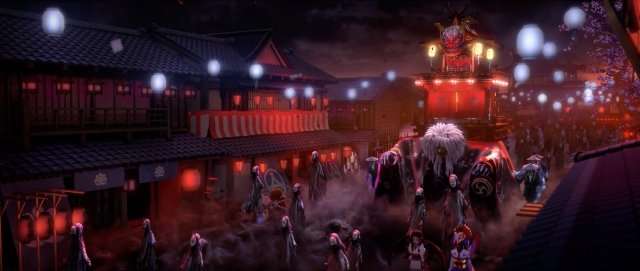 巨大的车舆随百鬼身影现出,暖色的街道随之染上鬼魅的色彩。人类未能窥视的妖怪们的世界中,盛大的游行缓缓拉开序幕,鬼王之宴的鼓声,即将敲响。
