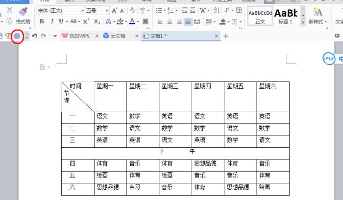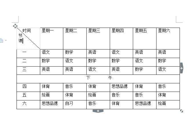 7、斜线表头就制作完成了,在两侧打字,这样一个课程表就制作成功了。点击打印,就可以收到。剪下来贴在课桌上。在制作过程中如有失误可以撤销,撤销键下图红圈,点一下就撤销一步。