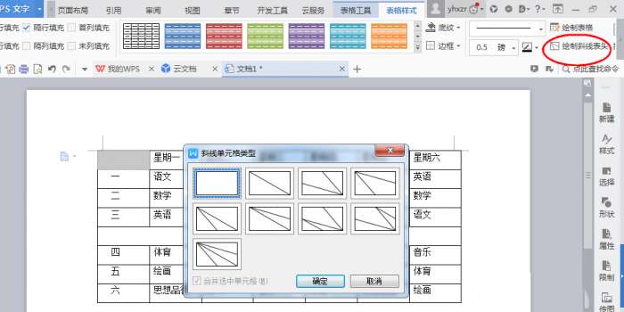 6、在左上角,要画一个斜线,选择左上角格子,变为灰色,在菜单----文字---表格样式---绘制斜线表头,选择想要的样式,点击。
