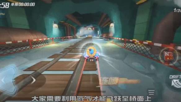 由于木桥是一座断桥,所以平跑是无法直接到达桥面上的,咱们需要利用氮气加速,才能顺利到达桥面。各位车友记得走到宝藏区域的时候,提前存好氮气哟!