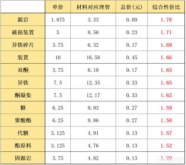 这里的所有材料都不推荐兑换。之所以做了下面这个表,只是出于强迫症。综合性价比表格如下图所示(降序排列):