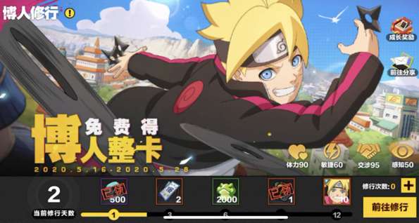消耗修行次数使博人修行,第12天可获得C忍漩涡博人整卡,也就是通过登录天数直接获取忍者的一个活动,相信这也是很多新玩家加入的动力(应该有很多00后甚至10后喜欢博人而接触疾风传的吧)。