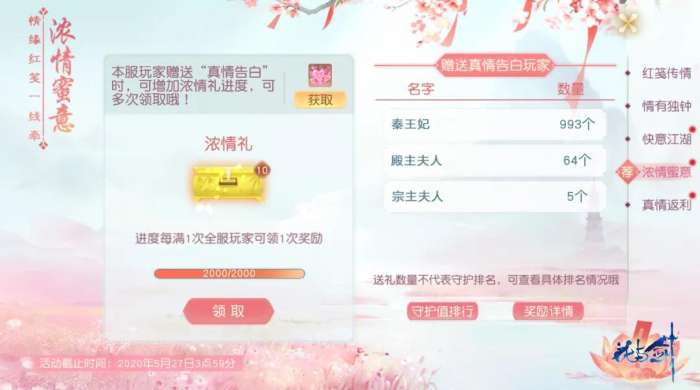 本服所有玩家赠送礼物“真情告白”时,都会增加浓情蜜意进度,进度满时,全服所有玩家都可领取奖励。可多次领取哦。