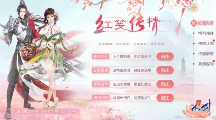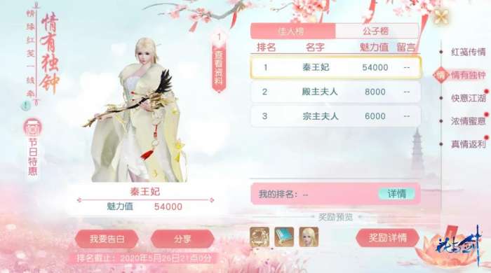将在2020年5月20日8点—2020年5月26日21点开启情有独钟榜单,赠送红笺或真情告白礼物,对方可增加魅力值,自己可获得佳人守护值/公子守护值。