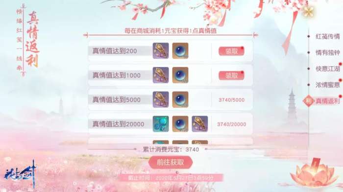 活动期间将开启真情返利,消费元宝可获得真情值,可获得玉珠、玉魂、稀有飞行载具“情有独钟”等奖励。