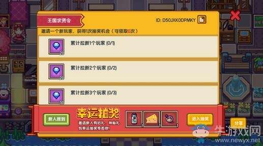王国求贤令:玩家邀请小伙伴进入游戏后,双方都会得到大礼,不仅如此,玩家邀请好友成功后,还会有“幸运抽奖”的机会,神秘礼包等着你噢!之后到达一定等级时,也会得到优化部分新手任务和地宫设置的奖励,冒险家们,赶紧带上小伙伴来伊洛纳冒险吧!