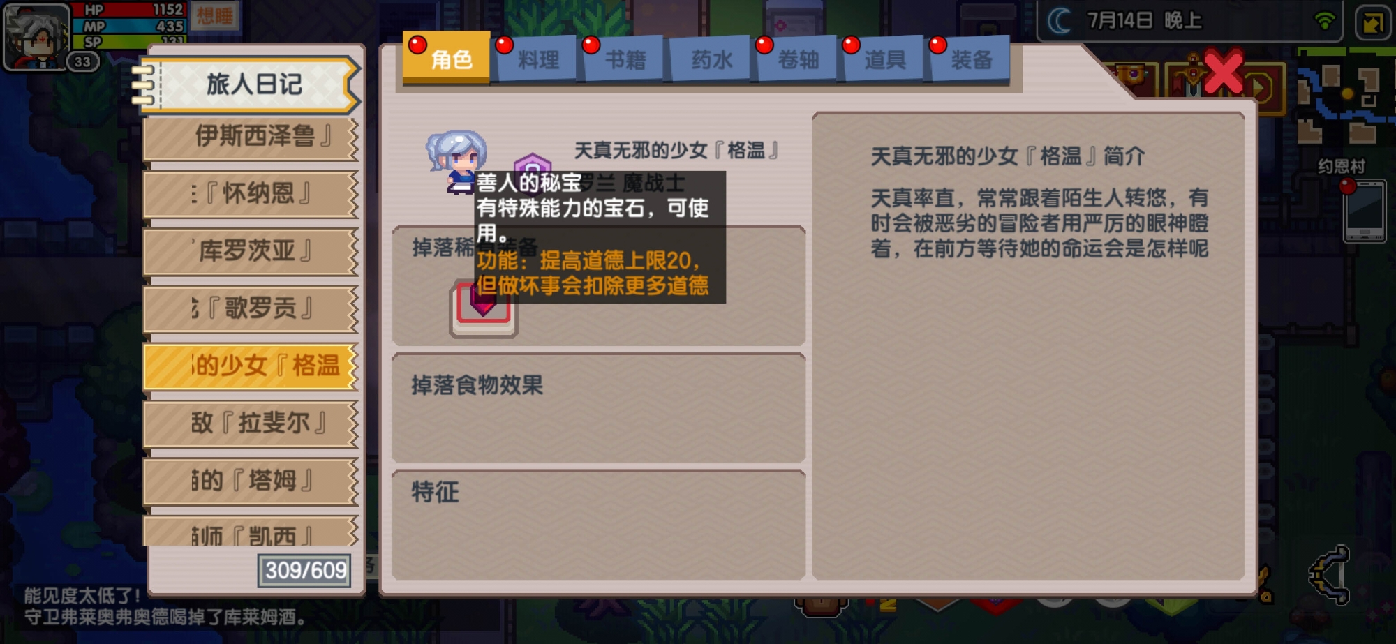 那么还需要了解一下的就是在图鉴页面可以查看NPC是否会掉落秘宝,比如说位于约恩村的天真无邪的少女格温,她就会掉落“善人的秘宝”哦。