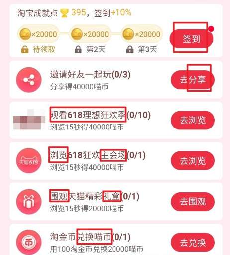 任务有:签到、分享、观看618理想狂欢季、浏览主会场、围观礼盒、兑换喵币等等。