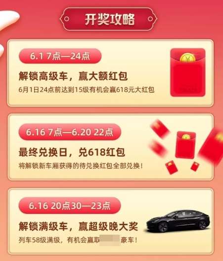 最后,是大家最关心的开奖攻略。请注意各时间点,6月1日24点前达到15级有机会赢618元大红包;6月16日7点-6月20日22点,兑618红包;6月16日20点30分-23点,58满级,有机会赢取豪车。