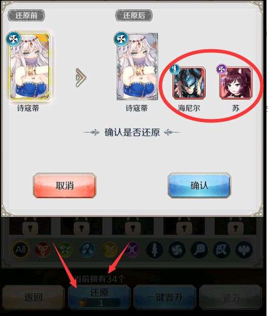 品质还原的具体功能已经有帖子详细说过,这里就不再赘述。简单说就是可以将英雄品质还原成晋升前的上一个品质并返还狗粮或者同名本体卡,除了SR狗粮还原后会有部分变成特定狗粮外,其余都是一样的。