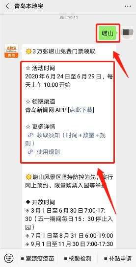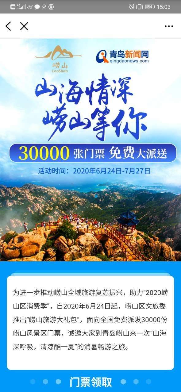 3万张崂山门票免费领!微信搜索关注【青岛本地宝】公众号,在对话框发送:崂山,即可获取领取通道,查看活动时间,领取规则,门票使用规则等信息!!!