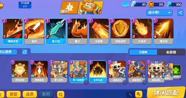 核心牌为蓄力,提升自己的战技卡伤害,后期一个旋风一大片。感觉没血了来发星之剑,感觉自己追不上那么就使用暴裂进军吧!撕裂敌方的阵型,将敌方英雄斩于剑下。强悍的小狮子不仅是战斗天才,还是魔法大师,在还没有将战技卡升起来时。遇到强大的敌方单位可使用太阳拳致盲直接斩首,遇到大群群低血敌方单位可使用火球术进行灭杀,火焰剑更是能够直接撕破敌方的防御城墙让敌方毫无防御可言!