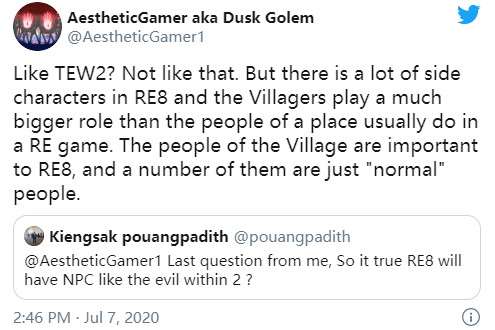 近日有网友向曾多次准确泄露了《生化危机》消息的推主Dusk Golem问到《生化8》是否会有像是《恶灵附身2》那样的NPC。Golem回复说《生化8》并不是那样,但会有更多的配角。