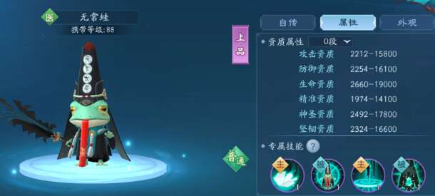 总评:上品宠物资质平平,首选推荐两只活动宠,技能概率掉钱(蚊子再小也是肉),如果没有只推荐88级的无常蛙。