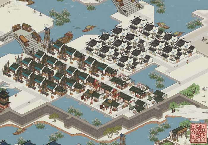 这个是14民居,肯定不是极限,只是我水井没建完,不着急迁民居就先这样摆了,未发光的是我填进来的商铺和装饰。