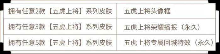 1.集齐5款五虎上将系列皮肤,可额外获得五虎上将英雄专属回城特效。(活动将于五虎上将系列最后一套皮肤上线后开启)。