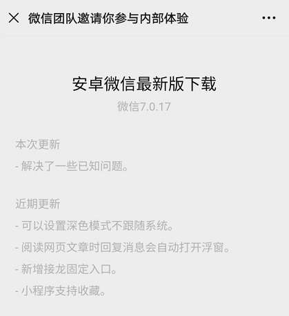 微信7.0.17版本中解决了一些已知问题。微信官方指出,近期更新有:可以设置深色模式不跟随系统;阅读网页文章时回复消息会自动打开浮窗;新增接龙固定入口;小程序支持收藏。