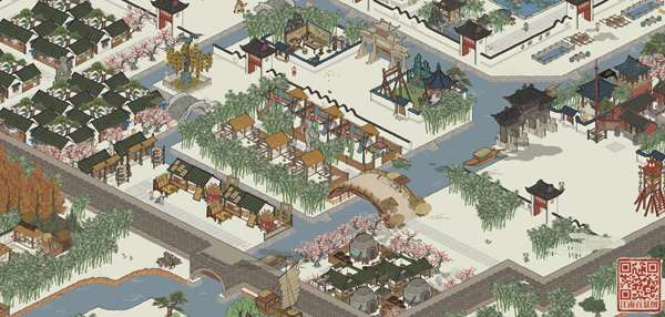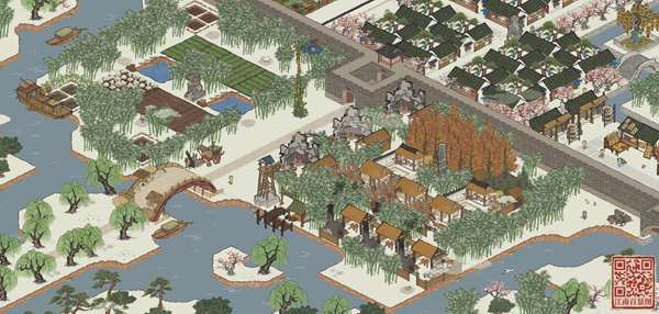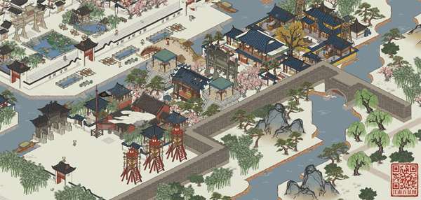 『道观』区域属于地图角落且不规则,由于道观占狭长且建筑层次感突出,我就把道观交错放在这里了,并且炼丹炉画风和道观完美融合,非常不错哦,空隙点缀竹林更加美腻