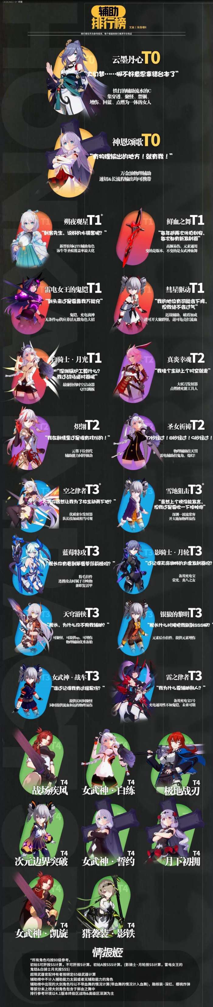 还是和以往一样分为输出女武神和辅助女武神, 两个排行榜均为角色强度排行榜,毕业成本、操作难度等均未纳入排行依据,请各位舰长结合底部注解理性分析。