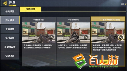 例如玩家在开火模式的选择上,就可以根据自己对移动端FPS手游的精通程度进行判断,例如对新手玩家来说,选择“一键举镜开火”可以用两根手指实现移动瞄准射击,同时在单发狙击枪模式下,一键举镜可以实现松手即开枪的手感体验,有一种自信收镜瞬间秒人的爽快感。