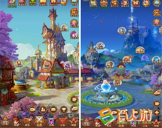 《闪烁之光》采用了2D+3D的多图层表现形式,主城为欧式村落,在细节中隐藏“心机”,比如环境构筑的动态阳光、水波、花草、落叶等,红龙、白鸽、猫咪、精灵等元素的添加增强了互动感,大场景也会随白天黑夜呈现不同变换。另外,值得一说的就是游戏战斗场景的绘制,虽然是2D,但是暖色调设计十分精美,场景变化也非常丰富,玩家能切身感受到不同的冒险风格。
