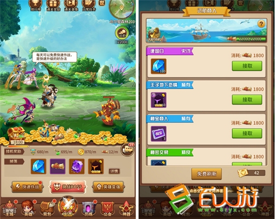 游戏不再局限于单纯挂机,远航功能让英雄放置得到最大化体现,只要是游戏里叫得出名字的资源,无需手动操作,通过一键派遣英雄完成远航任务都能得到。除此之外,高星碎片会在挂机的时候掉落,偶尔还会伴随远航任务出现,这么看来,集五星英雄应该不是顶困难的事情。