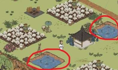 图中圈出的小河塘就是河虾的获取来源了,小河塘在探险的地图中还是有很多,细心的玩家很容易就能够找到。