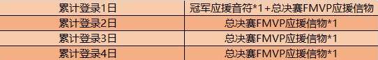可通过累计登录获得冠军应援音符*1+FMVP应援信物*4。