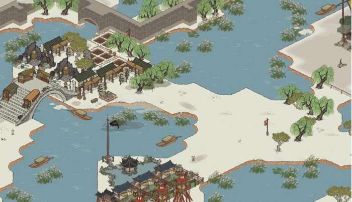苏州府地图上线之后,玩家对这张地图褒贬不一:从地形上看,由水分割出的小空间颇有水乡气质,与第一张应天府地图存在明显区分;然而地形有曲有折,建筑却都以方格作为单位搭建,方正的建筑放置在不规则的小区块上的实际效果,着实算不得精致美丽。