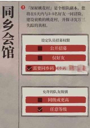 ②队长创建队伍时, 如果想在游戏内随机匹配好友,注意将队伍设置为“ 公开队伍”;如果想和游戏内的好友组队,注意将队伍设置为“好友队伍”;如果已经提前找好了队友,注意将队伍设置为“私密队伍”,队友在同乡会馆组队界面输入队长的同乡码即可进入队伍。