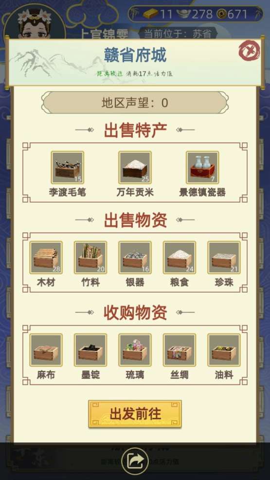 3,就点开外省,查看府城收购品。然后从周围地区找到之后去那里卖了。就可以加声望。(卖多少箱就加多少声望。声望=地区好感。)就刷到100。就可以解锁当地特产。当地特产无论卖到哪里都会收,价格一般不会低于收购价。(当然,跑远一点,当比较富裕的地方应该价格会高一些)