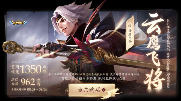 王者荣耀手游中,曜的Fmvp皮肤“云鹰飞将”已经于2020年8月8日0点上架正式服皮肤商店,皮肤品质为史诗,原价1688点券,参与活动收集令牌还可以领取388点券的专属红包(已结束)。
