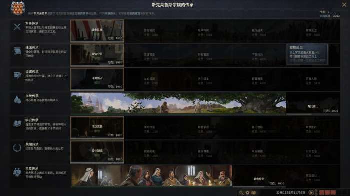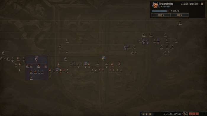 现在让我们回到之前的话题,游戏里的继承机制其实非常简单。继承了玩家当前扮演统治者主头衔的同宗族角色将会成为下一个玩家扮演的角色。因为游戏中完整的模拟了婚姻、生育等相关系统,所以可以衍生出宗族这一血缘关系。根据结婚时采用的父系/母系婚姻类型,诞生的小孩会延续父亲/母亲的宗族,进而衍生出庞大的宗族树。宗族树的任意一个角色只要获取到了玩家的主头衔,无论是通过继承或是通过篡位的宣战理由,都会立刻变更为玩家的当前操作角色。所以从某种角度说,王国风云系列是一个经营宗族的游戏,只要强力封臣都是玩家所在宗族的角色,即使发生了篡位,玩家依旧可以用新角色继续之前的旅程。