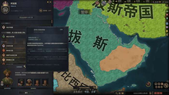 游戏里的继承机制其实也就是头衔的继承,每个统治者会根据自己的继承法将头衔分配给继承人。除了有着特殊选举制的帝国和王国之外,其他头衔可能会分配给玩家的所有继承人(均分继承法),或是全部给一个指定继承人(单一继承法)。值得注意的是,在游戏的早期,十一世纪之前,大部分统治者是只能使用均分继承法的。十一世纪以后才能根据对应文化革新的进度依次解锁出不同的单一继承法。如何在均分继承法的机制下如愿以偿地传承头衔,也是游戏前期的一大难点。
