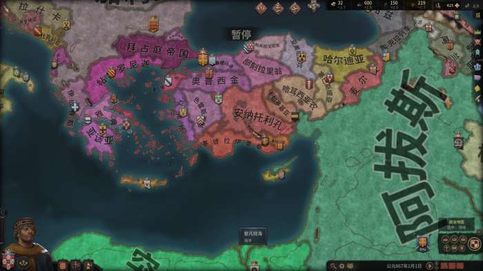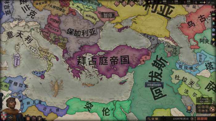 我们以游戏里的拜占庭帝国为例,虽然拜占庭帝国占领了辽阔的疆域,但由于西欧中世纪并没有类似于中国的官僚制度,所以领主的治理能力往往是有限的。对于早期的小领主而言,可能只能亲自管理3、4块直辖领地,即使是后期的帝国之主,也只能最多管理十几块直辖领地(对比一下,上图中的拜占庭帝国一共有87个伯爵领的大小,每个伯爵领中有3、4块地产)。