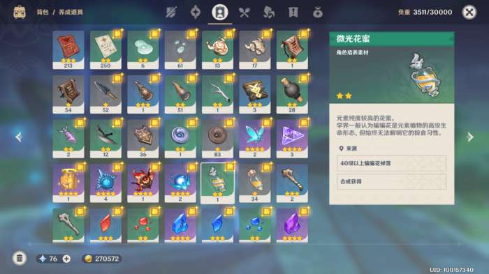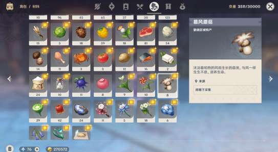不用问,问就是看到的全部带走。天上飞的、水里游的、地上跑的、长树上的、长土里的、带亮光的,这些素材都有它的用途。打开【合成】界面,你会发现青蛙都能来入药;【烹饪】界面里的菜品构成更是麻烦的离谱。更不要提一些素材看似不起眼,但事实上它们竟然是角色的突破物品,比如【慕风蘑菇】、【风车菊】、【石珀】等物品。有些素材平时不收集,只怕用的时候才追悔莫及,所以说要养成随时随地收集物资的好习惯。