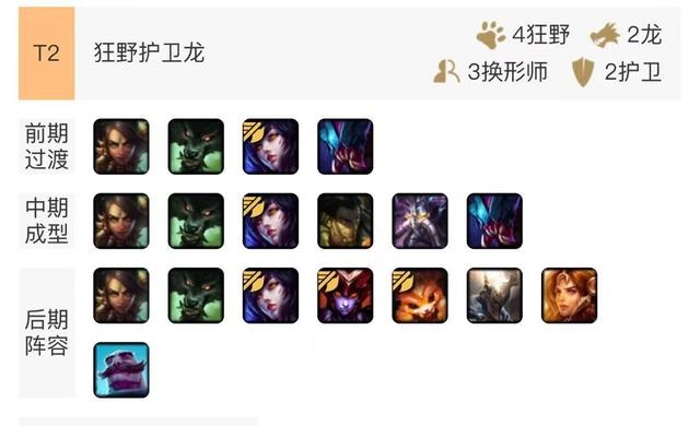 前期使用狂野过渡,狐狸作为主要输出英雄其实战斗力非常强,狂野的高攻速效果配合狐狸的二段真实伤害输出能力非常强,如果在前期搭配卢登的话那轻而易举的获得一波连胜。六人口可以卡牌,狐狸,卡萨丁,挖掘机,狼人,狐狸进行过渡,七人口的时候如果没有潘森,物理阵容多就护卫,法系输出多就双龙,龙王可以不追二,狂野龙法只是过渡,它在目前环境里并不如狂野护卫龙。