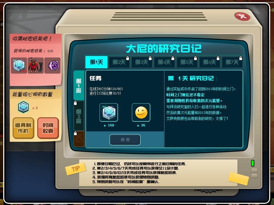 活动开启后,玩家可以通过参与大尼的研究日记和广场活动获得能量核心,能量核心可以用于制作道具。道具制作机里的制作的道具会保管在“时间胶囊”中,12月12日服务器维护后可以在转送中领取。每个道具有制作次数限制,稀有角色包3个中只能选择一个角色制作一次。