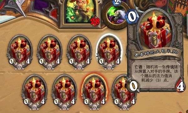 对局开始时双方场上都会有四个大包礼物:“亡语:随机将一张传说随从牌置入对手的手牌。该随从的法力值消耗减少(3)点。”