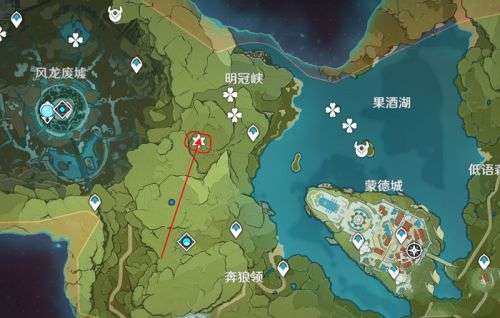 1、明冠峡在蒙德城和风龙废墟的中间位置,下图就为大家标记了宝藏的具体位置。