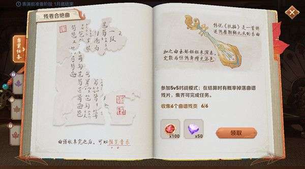 玩家们获取曲谱残页的途径包括:参加5V5对战模式;在结算时有概率掉落曲谱残片。集齐可完成任务。
