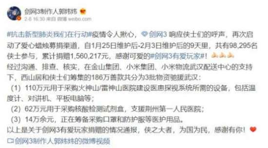还有一些玩家发挥自己的技能来为武汉加油,一位微博id“November_阿瑜瑜瑜瑜”的玩家利用剑网3的编辑器,为武汉和已病故的李文亮医生做了一段视频。她说:“为人抱薪者,不可使其冻毙于风雪。”希望以这种形式,来让大家永远记住这位“吹哨人”所做的努力。而这段视频也被剑网3官博转载,在玩家群体中引发广泛的讨论。