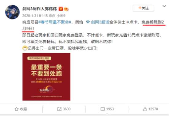 当然,玩家们的种种善举,与游戏官方一直以来对玩家正面行为的鼓励是分不开的,并且玩家背后始终有官方的身影。疫情期间,为了响应居家隔离的号召,剑网3在春节期间推出了免费畅玩游戏的活动,鼓励玩家减少线下社交。