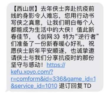 其实,西山居去年送点卡、送称号、挂广告牌表彰玩家的举动在当时也受到了一些质疑,很多人觉得这是作秀、或是当成炒作噱头的工具,一旦疫情过去,谁又会记得这些玩家?面对争议,西山居并没有反驳,而是用实际行动告诉大家:不是炒作,而是真心——因为就在前几天,不少“逆行者”玩家收到了一条来自官方的短信: