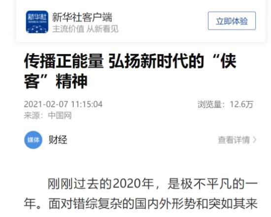 2月6日,新华社、中国网、中国新闻周刊等多家政府媒体再次发文《传播正能量 弘扬新时代的“侠客”精神》,称赞“西山居和玩家们一直以来对企业和个人社会责任的积极践行以及通过不断拓展游戏的文化内涵和价值边界,为社会意识的进步和发展做出的小小贡献与改变,正是新时代“侠者”精神的有力诠释。”