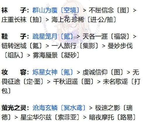 鞋子:疏星笼月 [氪] > 天各一涯 [福袋] > 链转迷城 [氪] > 一人旅行 [集影] > 曼妙步伐 [组队] > 雾海蜃景 [凝砂]